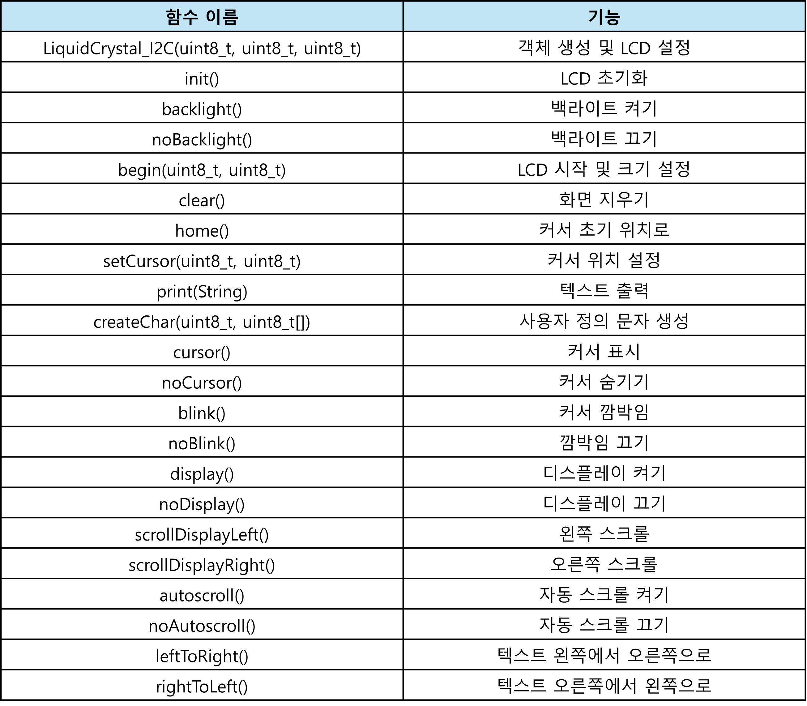 LiquidCrystal I2C라이브러리의 함수들과 각각의 기능들을 아래 표에 정리해놨다.
