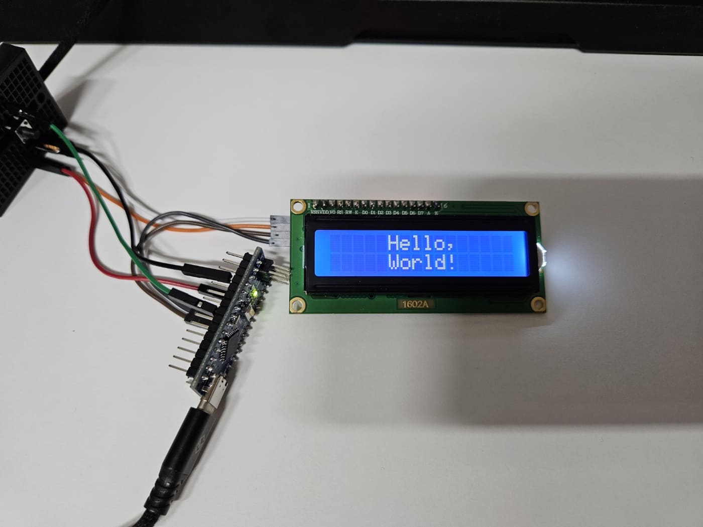 lcd.setCursor를 통해 글자를 작성할 좌표를 지정한 이후, lcd.print를 통해 출력할 글자를 적으면 아래와 같이 LCD에 해당 글자가 출력되는 형태이다.